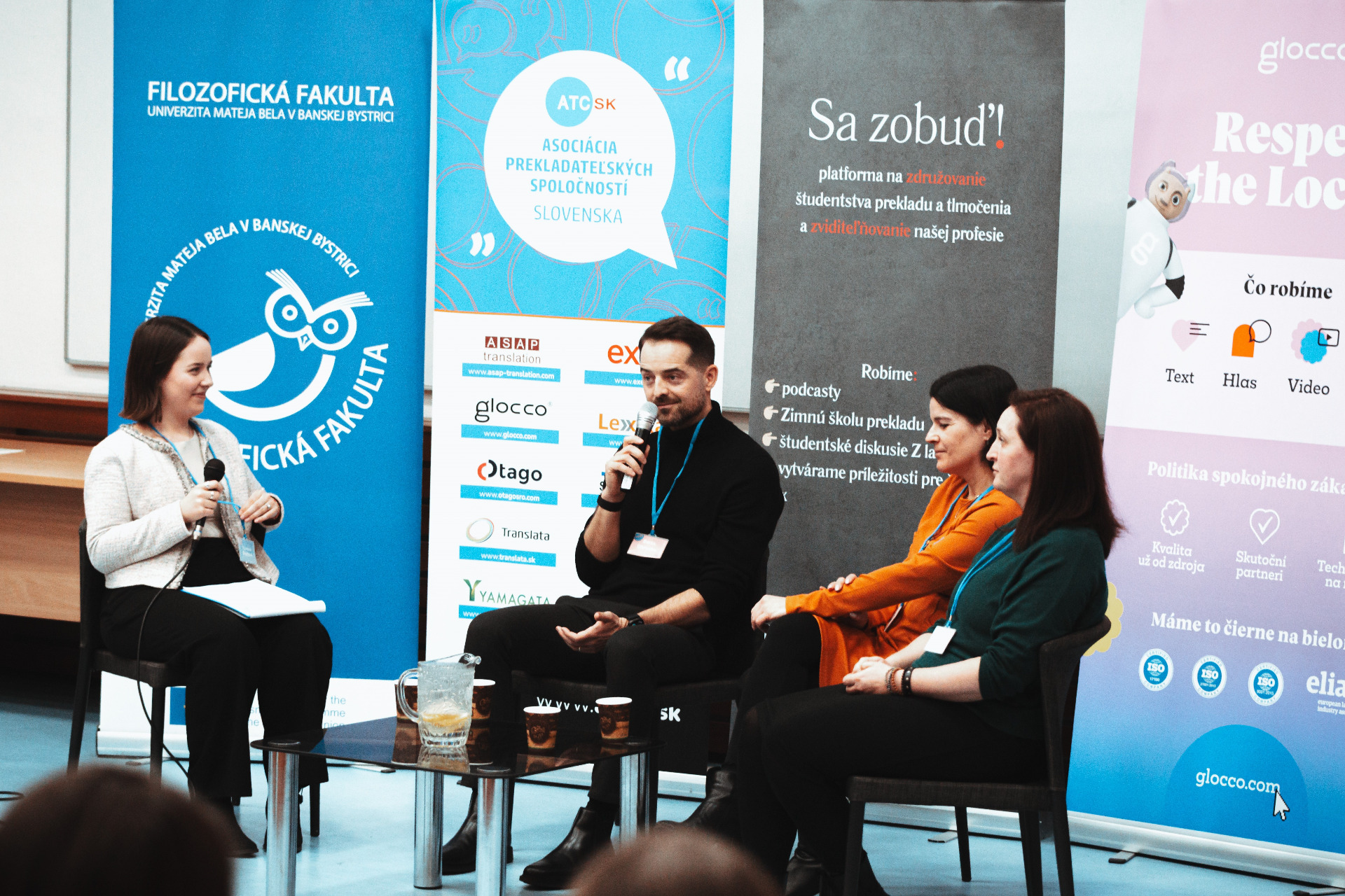 Katka Absolonová spolu s manažérkou dodávateľov Zuzkou Kolejákovou zo spoločnosti exe.sk aj tento rok pripomenuli študentom katedry anglického jazyka Asociáciu a špecifiká spolupráce s prekladateľmi, ale priniesli aj horúcu tému - uplatnenie lingvistu v dobe AI.