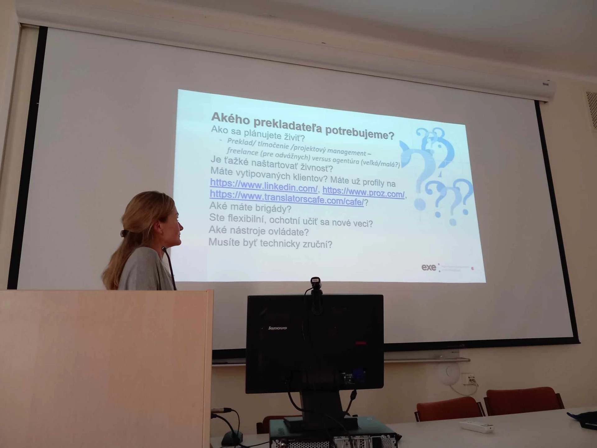 On February 29, the Association presented itself at the invitation of doc. Mgr. Pavel Šveda PhD. to second-year students at the Department of English Studies, Faculty of Arts, Comenius University in Bratislava. K. Absolonová from ASAP-translation.com explained what it means to be a professional company, vendor manager Z. Kolejákova from exe informed the students about the conditions for cooperation with future translation graduates, and M. Kmeť from Otago gave a captivating account of the life cycle of a translation project, from request to delivery. The lecture was met with lively interest from the students. They also asked about internship opportunities.