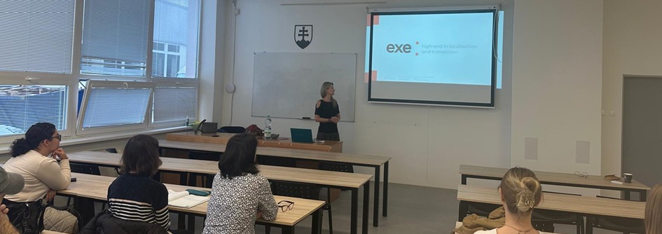 Katka Absolonová, together with supplier manager Zuzka Kolejáková from exe.sk, reminded students of the English Language Department about the Association and the specifics of working with translators, but also brought up a hot topic—the role of linguists in the age of AI.