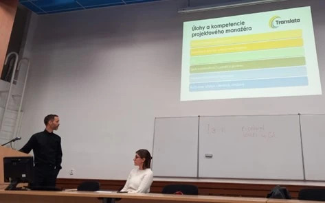 4.11. K. Absolonová from ASAP-translation visited Cyril and Methodius University in Banská Bystrica again, where she presented the Association, its code of ethics, and the characteristics of a professional company to students during a praxeology class. Jakub Joštiak, an experienced member of the company, joined her in presenting Translata and project management procedures. K. Absolonová went on to explain to students that in an era of ever-improving technology, the profession of traditional translator is taking on new directions, such as MT editor, SEO engineer, AI prompt designer, AI text editor, copywriter, terminologist, and the like.